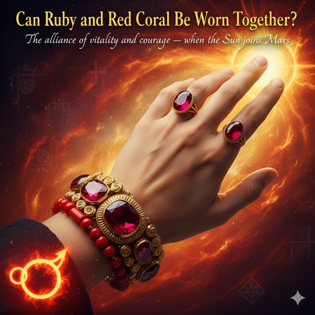 Hence, Ruby and Red Coral are highly compatible gemstones and can be worn together safely in most charts, provided neither planet is debilitated or afflicted by malefics such as Saturn, Rahu, or Ketu.