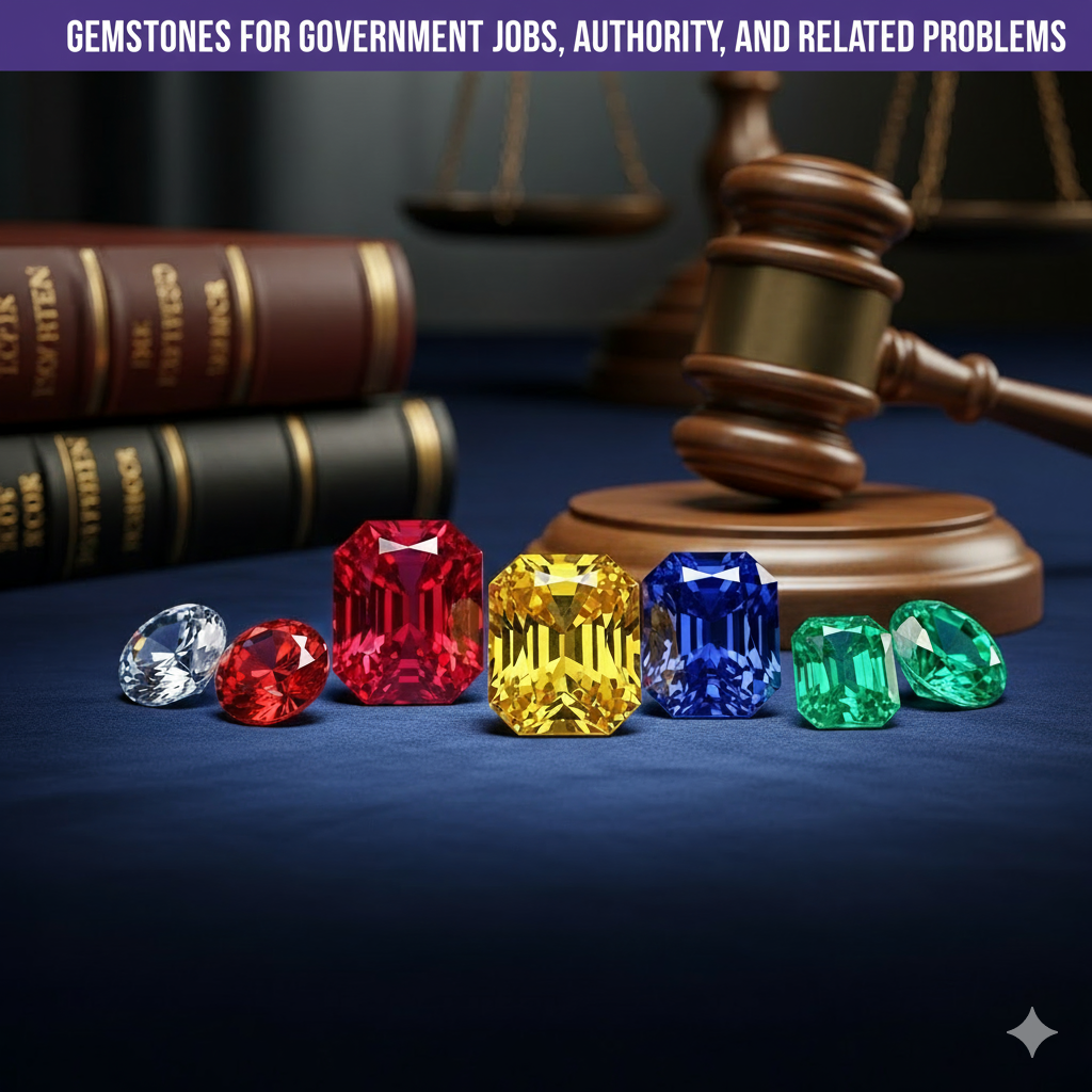 Government jobs demand discipline, wisdom, and karmic stability. Gemstones, when correctly prescribed, strengthen planetary support to aid exam success, promotions, and service stability.