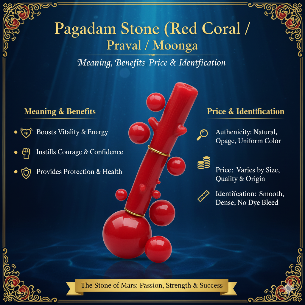 Pagadam (Praval / Moonga / Red Coral) represents a rare harmony — the fiery essence of Mars born from the ocean’s calm.