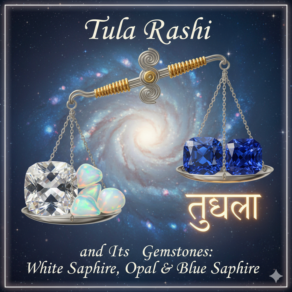 For Tula Rashi (Libra) natives, gemstones align Venus’s grace with Saturn’s exalted strength. White Sapphire (Safed Pukhraj) brings harmony and prosperity, Opal adds creativity and romance, and Blue Sapphire (Neelam), empowered by Saturn’s exaltation in Libra, ensures discipline, protection, and career success.