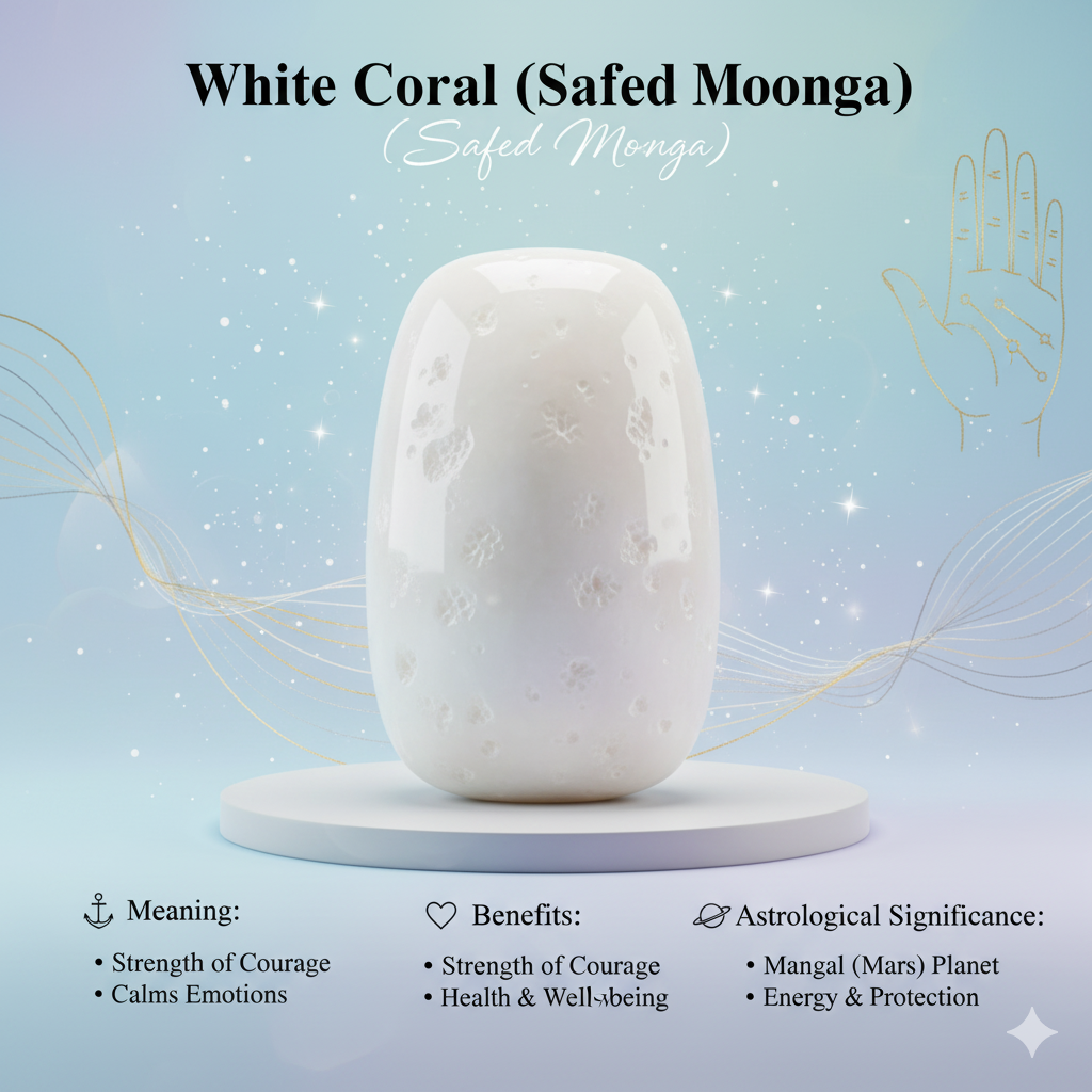 White Coral, known as Safed Moonga in Hindi, is a rare organic gemstone formed from the skeleton of marine corals. Unlike the fiery Red Coral (Lal Moonga), White Coral carries a softer and more calming energy.